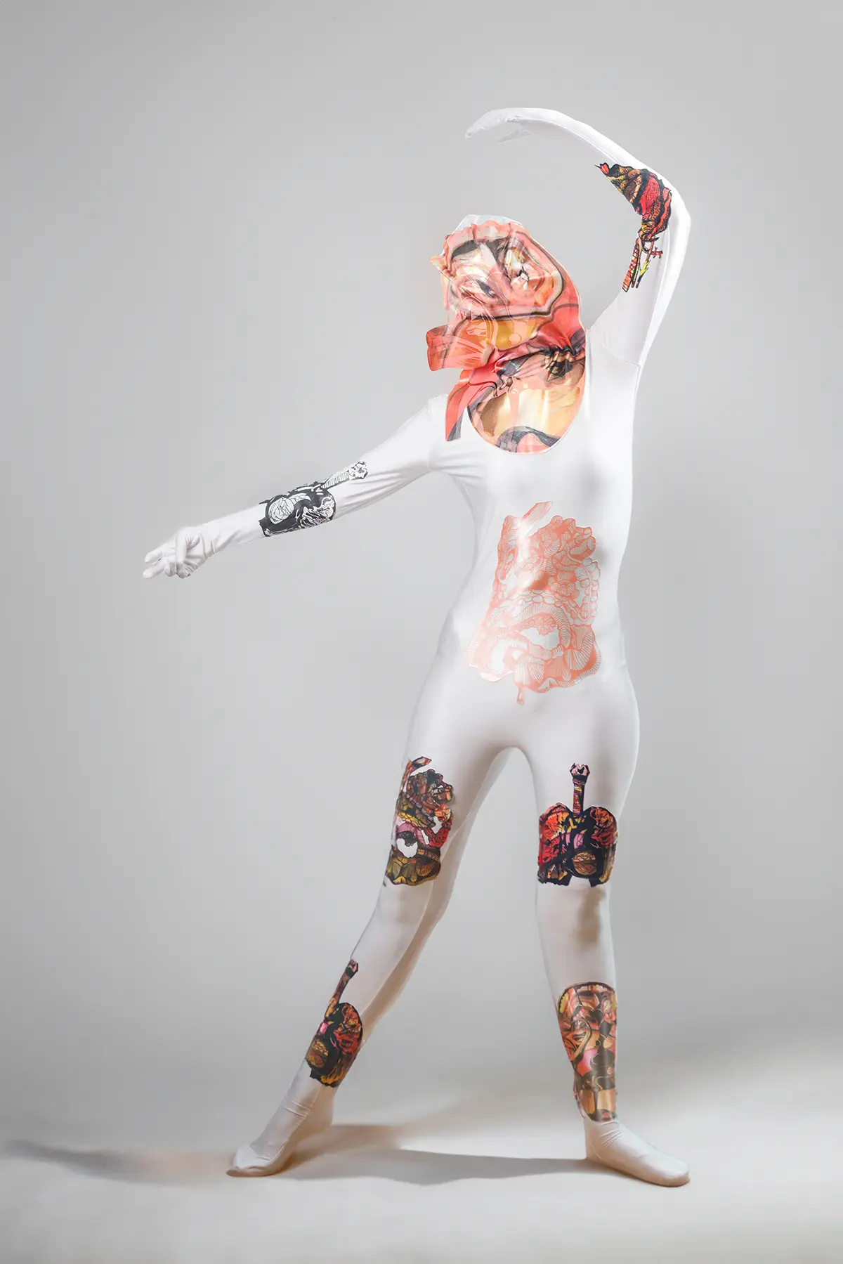 After experimenting with the developed textile print samples on the stand and creating digital visualisations to assess print placement on the body, I finalised the composition for the metallic Lycra bodysuit. The organ illustrations were printed separately and then appliquéd onto the garment to achieve greater dimensionality and clarity of form. The finished piece is presented on the dancer in motion, demonstrating how the anatomical imagery interacts with the body during performance.