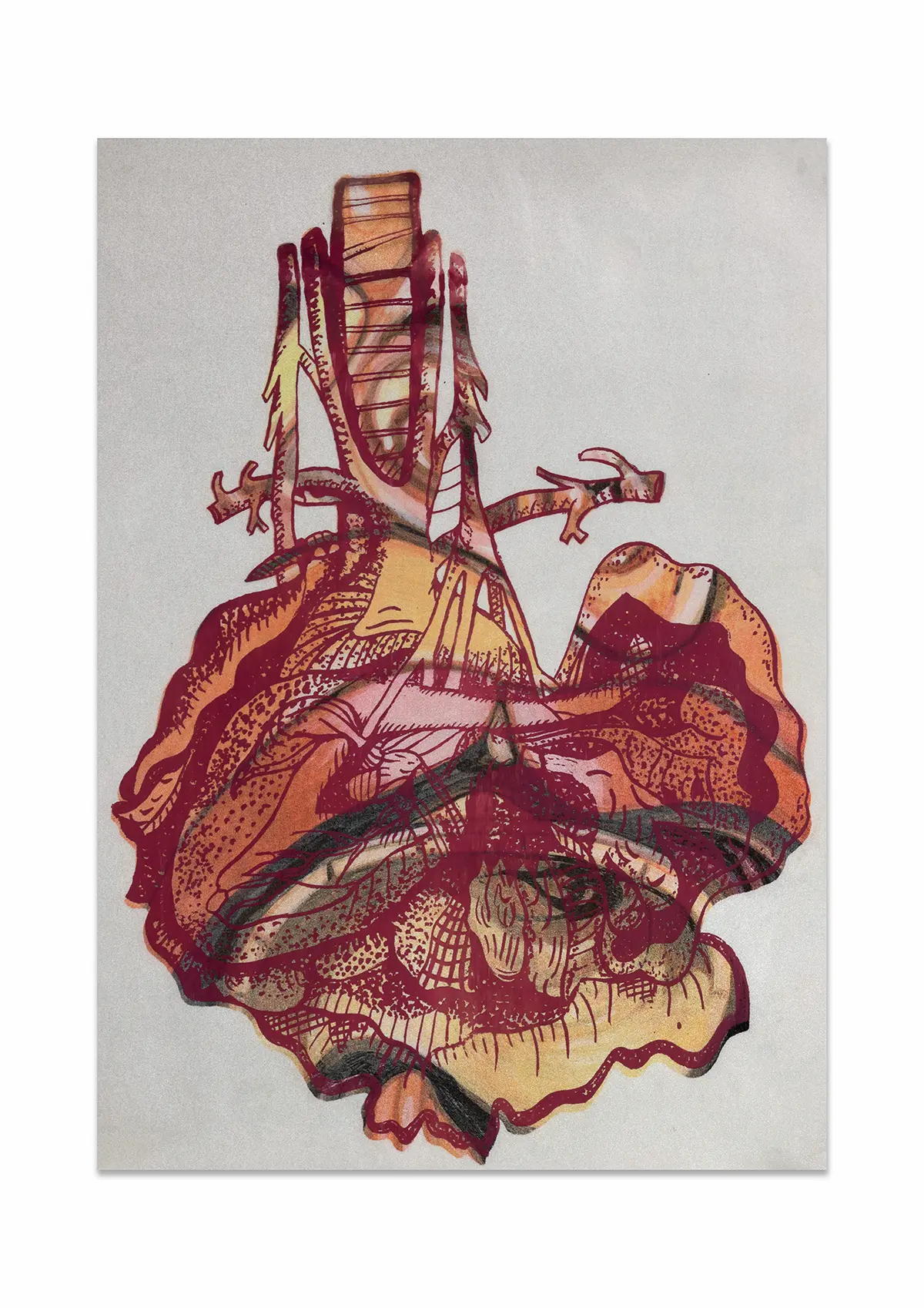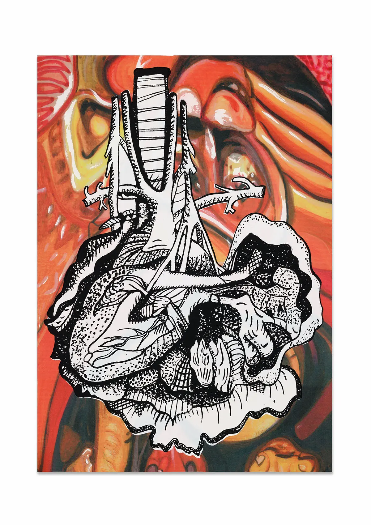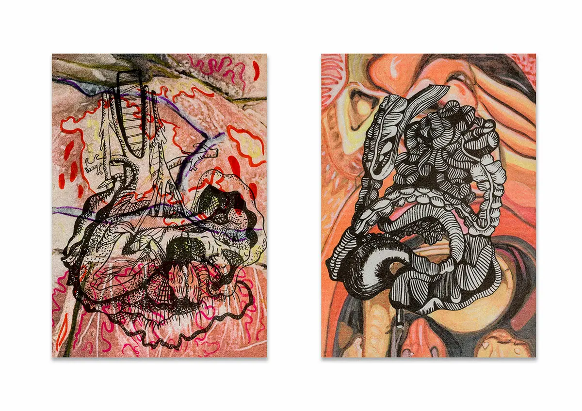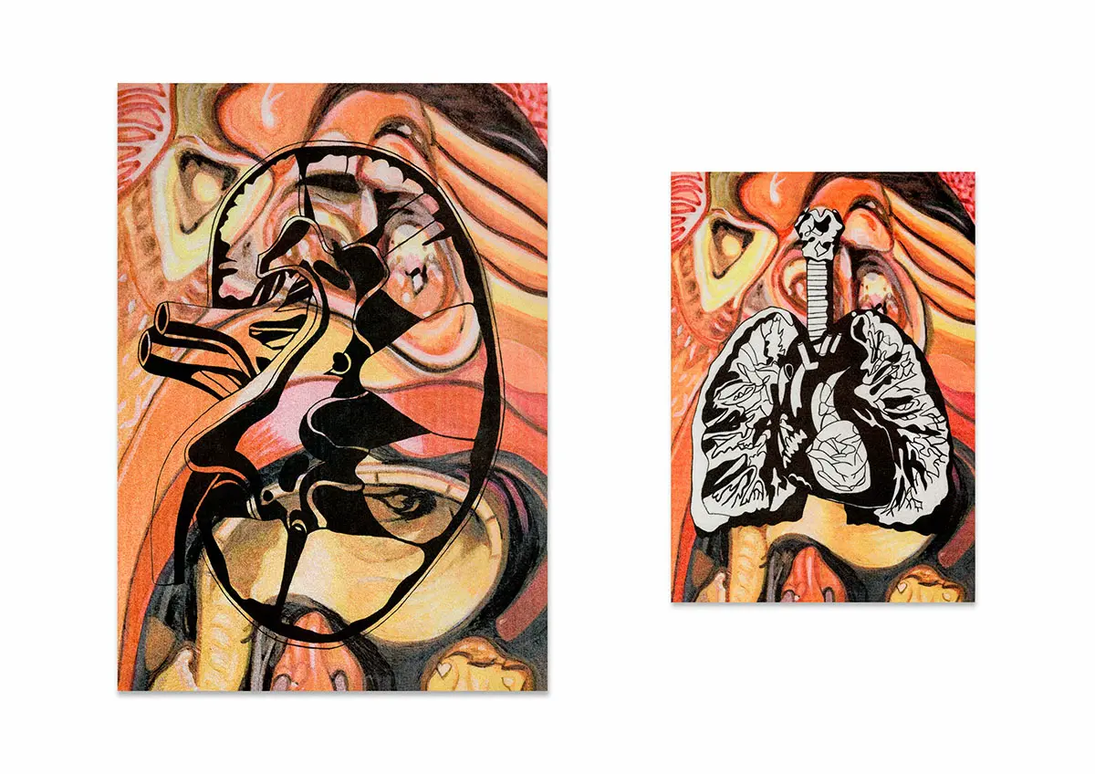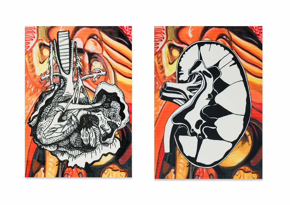 In this project, I drew inspiration from The Body Intelligence Collective, a dance group whose stage performance, Digital Umbilical, engaged the audience’s bodily processes as a rhythmic foundation for movement. Inspired by their concept, I set out to visually enhance and redesign their costumes. It was important for me to communicate their central focus on bodily anatomy while preserving the decorative richness historically associated with stage performance wear. To achieve this, I treated the dancer’s body as a canvas, reinterpreting medieval anatomical illustrations, often characterised by stylised inaccuracies due to the religious persecution of human dissection at the time, and merging them with traditional embellishment motifs found in early-twentieth-century dance costumes, such as woodblock-inspired patterns. Using medieval anatomical studies as a starting point, I created stylised ink paintings of internal organs, including the heart, kidneys, intestines, and lungs. These illustrations were then developed into textile print variations and sampled on different metallic Lycra fabrics using heat-press and screen-printing techniques in A4, A3, and A2 formats.